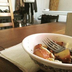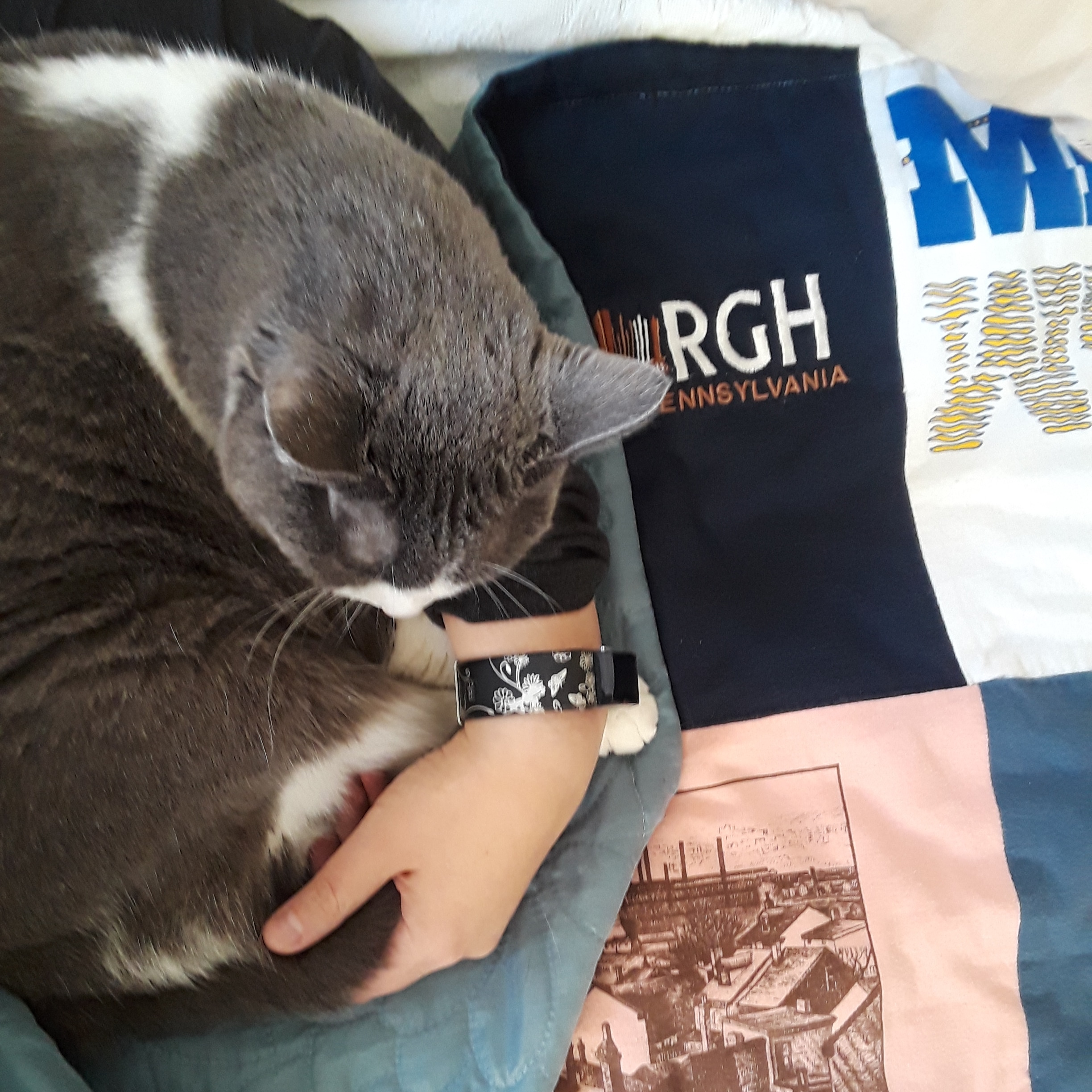 She had pancreatitis, which in cats is fairly treatable if you catch it soon enough, but it often indicates another issue. In our case, the other issue turned out to be inflammatory bowel disease, which also has a promising prognosis. It is now almost six weeks since I first took her to the vet, and almost two weeks since she started her steroid treatment (which she doesn’t care for, and she’ll run me a merry chase if I’m not sneaky enough). She wants to eat everything–especially whatever I am eating–and has taken to lingering in windowsills where she can get a good look at my plate. She curls up in her place by my heart as I fall asleep; she finds her way back before I’m fully awake, but in the dreamy window between my alarms I hear her chattering at the birds outside my window. And she marches the poodle up and down our spiral stair on a schedule known only to herself, bringing it wherever she feels it is needed most.