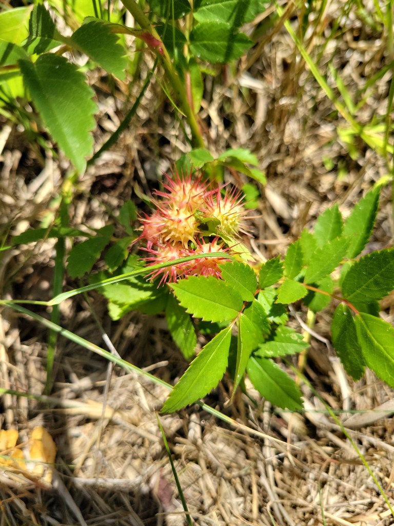 Although ISBP recognizes the edge of the road as its own zone, I did not make many observations as we crossed (being mindful of cars). Across the road, however, I was taken with the diversity of the maritime forest. Here we saw pitch pine (Pinus rigida) and a variety of oaks including Southern red oak (Quercus falcata) and willow oak (Quercus phellos), consistent with the pine-oak forest we observed on the mainland when we crossed into the Outer Coastal Plain. We saw that the serviceberry or Juneberry trees (Amelanchier canadensis) were in fruit, although most affected by cedar apple rust. I also observed many notable adaptations to the sandy and acidic but increasingly moist forest environment. For example, carnivory: spatulate-leaved sundew (Drosera intermedia) was almost hidden by the grass along the trail, but looking closely, we could see the glistening drops of mucilage that help this plant trap and absorb nutrients from small prey. Mutualism was represented by the rosettes of greenshield lichen (Flavoparmelia caperata) growing on a faded trail plaque; they are composite organisms formed of cyanobacteria and fungi filaments. We also observed rosy, spiky spheres that looked like spiny fruits growing on various rose species; these were parasitic galls, housing the larval forms of spiny leaf gall wasp (Diplolepis polita).