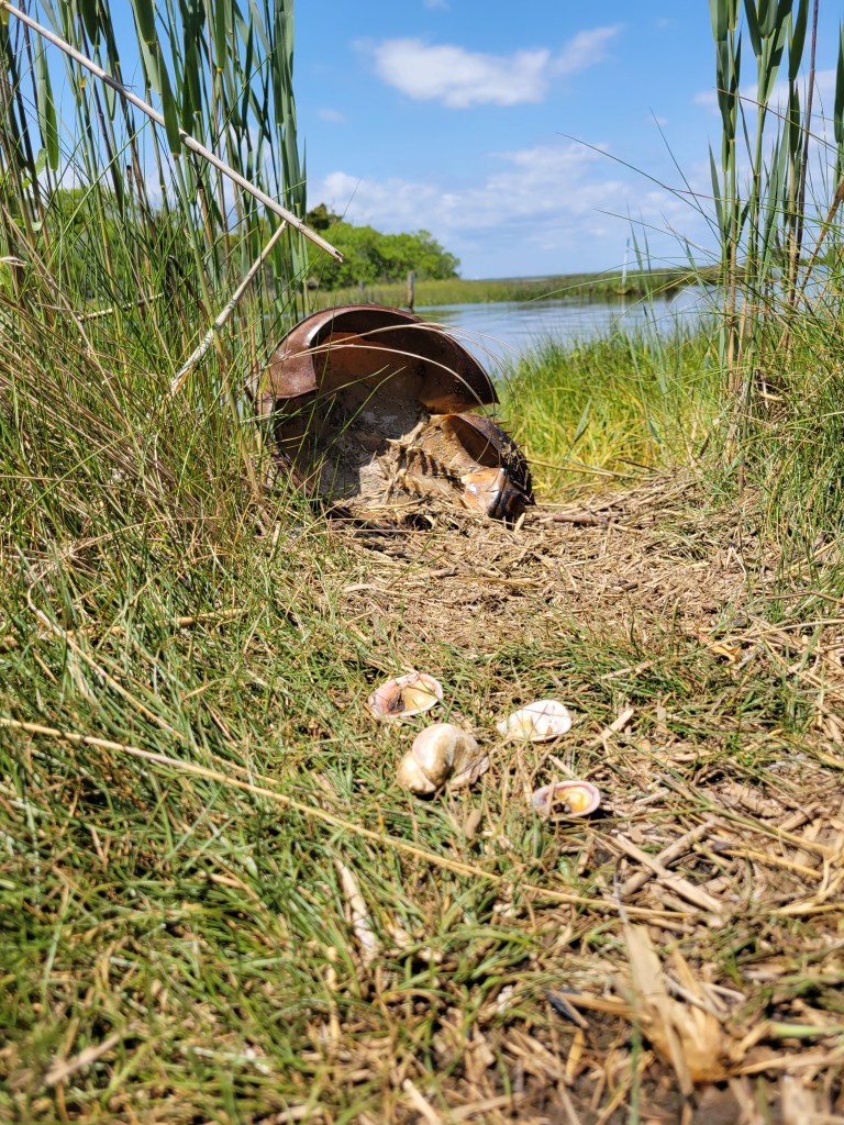 Beyond the maritime forest are tidal marshes, where the trail passes among saltwater channels lined with smooth cordgrass (Spartina alterniflora). I saw the empty carapace of a horseshoe crab (Limulus polyphemus) and a scattering of seashells (possible common slippers, Crepidula fornicata?) arrayed in a puzzling tableau; we also saw many redwing blackbirds (Agelaius phoeniceus) and a few snowy egrets (Egretta thula).