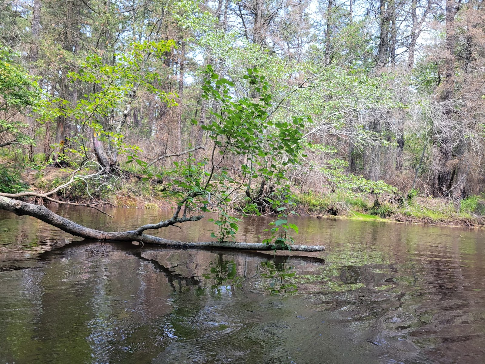 Further downstream, we passed some lowlands and savanna areas dominated by Atlantic white cedars (Chamaecyparis thyoides) with bluish bark. The number of fallen trees seemed to increase, to my eyes–my phone battery failed, so I could not photograph the section of river where towering cedars tilted over the water from both banks, forming almost a series of arches along the river. The Atlantic white cedars are shallow-rooted, so they are more likely to fall over when dead or damaged. They also don’t recover from fire, unlike the pitch pines upstream.