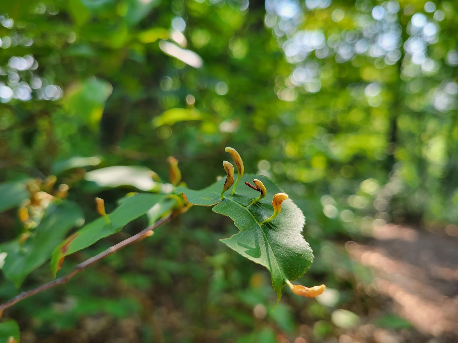 In the shrub layer, we saw many of the mature tree species in sapling form, including many white oaks–evidently the result of a mast year for acorns, and able to grow due to the absence of deer (which cannot easily reach the isolated cuesta forest). Some of the shrub-like black cherry trees (Prunus serotina) were covered in brightly colored growths: black cherry finger gall mite (Eriophyes cerasicrumena). Copious brambles, notably common greenbrier (Smilax rotundifolia) and raspberry/blackberry species (Rubus spp.), and poison ivy (Toxicodendron radicans) spread throughout. On the forest floor, we identified the white buds of spotted wintergreen (Chimaphila maculata) and the unusually named hairy forked nailwort (Paronychia canadensis), the latter of which is endangered in some states. There were a number of fallen trees, possibly due to wind and storm damage, as the high elevation cuesta is vulnerable to wind. As the trees decayed, they provided habitat and food to ants (Formicidae sp.) and fungi, including mossy maze polyphore (Cerrena unicolor).