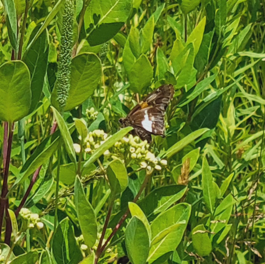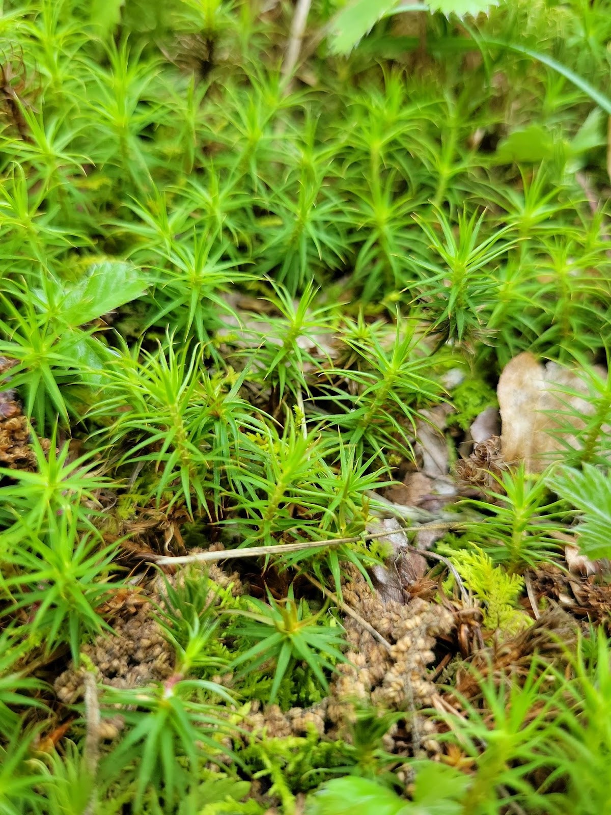 There were attractive plantings at the cemetery entrance, inviting several butterflies including the cabbage white (Pieris rapae). In this somewhat moist, low-elevation environment, we walked beneath mature hickory species–possibly bitternut (Carya cordiformis), according to my app. I also noticed a wide, spongy patch of common haircap moss (Polytrichum commune).