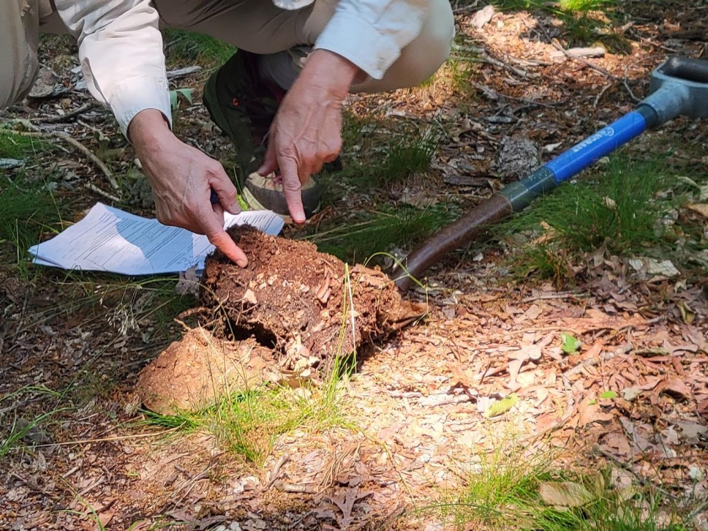 On the trail, we could see fragments of reddish-brown stone, remnants of the ironstone-rich slabs that made this cuesta resistant to erosion compared to the rest of the Inner Coastal Plain. A soil sample showed well-defined horizons: