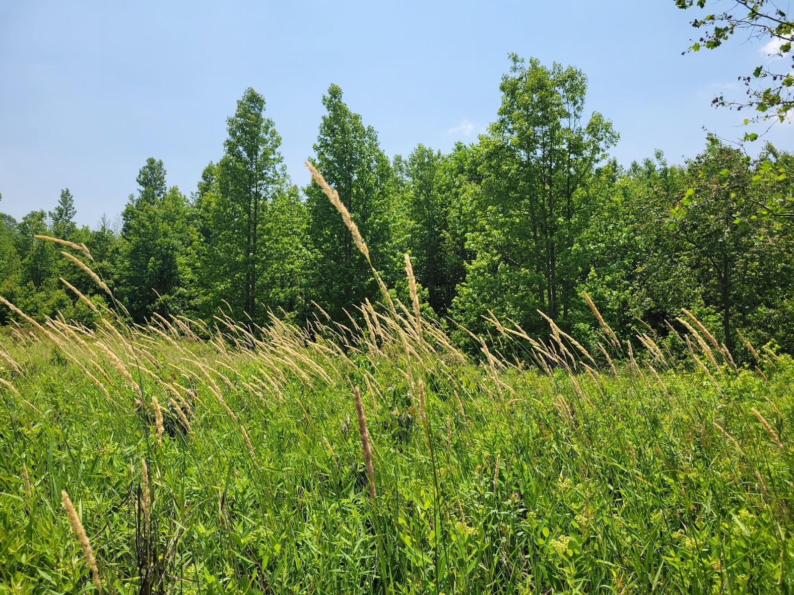 Reed canary grass bends in a passing breeze; the successional sweetgum forest is visible beyond.