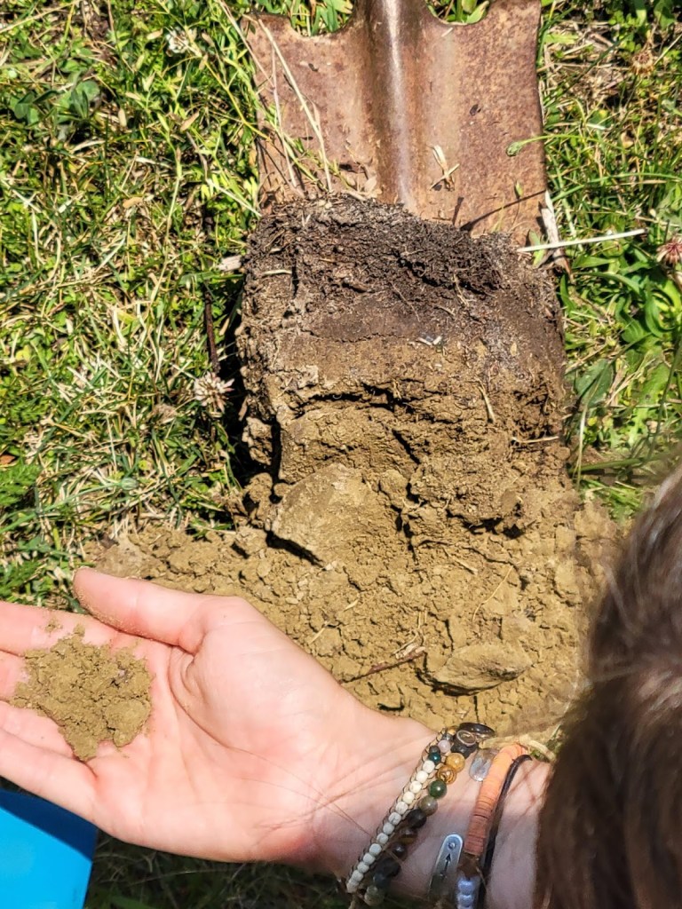 As we entered the mature sweetgum forest, where the sweetgum trees grew too tall for us to see their star-shaped leaves, we saw a few more shrubs, including American holly (Ilex opaca) and flowering dogwood (Cornus florida). The soil sample here (not pictured) featured sandy clay loam, slightly ribbony, with a slightly olive color.