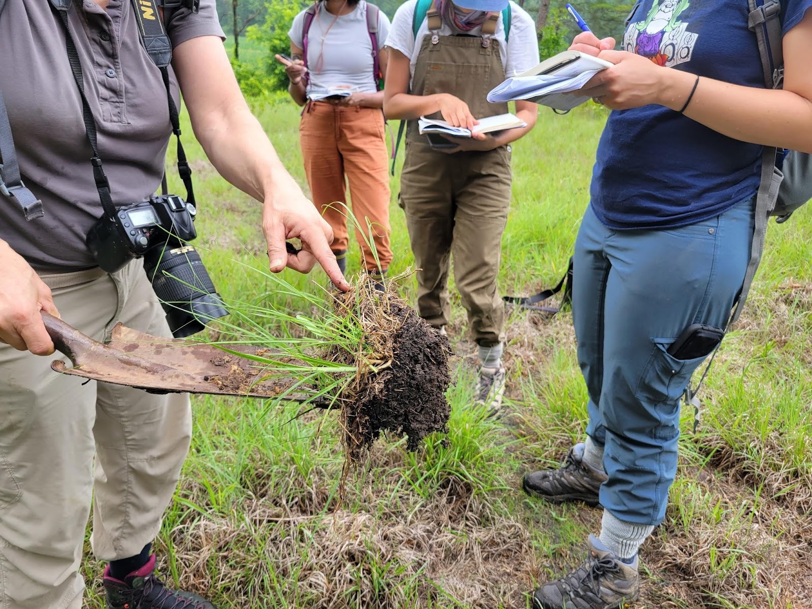 Where the serpentine bedrock is closer to the surface, we found grasslands. We visited a clearing on the southern slope of the serpentine ridge that has been managed using prescribed burns for around 25 years. Most of the grasses were not in a fruiting season, which made them challenging to identify, but the area included warm-season grasses such as Indian grass (Sorghastrum nutans), little bluestem (Schizachyrium scoparium), and big bluestem (Andropogon gerardii). We saw a pasture rose (Rosa carolina) beneath the Virginia pines at the edge of the clearing. A soil sample showed minimal organic material, since grasses decompose quickly, and a 6″ A horizon. No B horizon; the shovel clanged against rock at 6 inches.