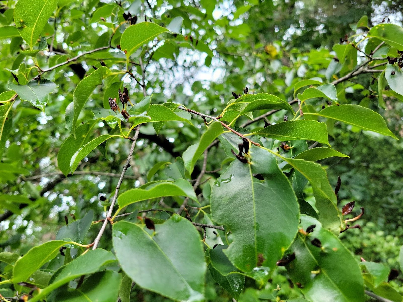 Serpentine bedrock underlies the wooded trail off Sugartown Road and adjacent fields, but is deep enough below the surface that the soil supports mature trees. The trail is shaded by a canopy of various oak species, including white oak (Quercus alba) and pin oak (Quercus palustris), as well as Virginia pine (Pinus virginiana) and shagbark hickory (Carya ovata). The understory was nearly overrun by what appeared to be roundleaf greenbrier (Smilax rotundifolia), although when we turned over their leaves and saw that some of them had pale undersides, we knew that catbrier (Smilax glauca) was also present. Brambles (Rubus spp.) and scattered deerberry (Vaccinium stamineum) and lowbush blueberry (Vaccinium pallidum) shrubs were scattered throughout. We identified black cherry (Prunus serotina) in shrub form, some with black cherry finger gall mites (Eriophyes cerasicrumena) on the leaves; these were blackened, rather than the bright orange galls we observed last month in Mount Holly.