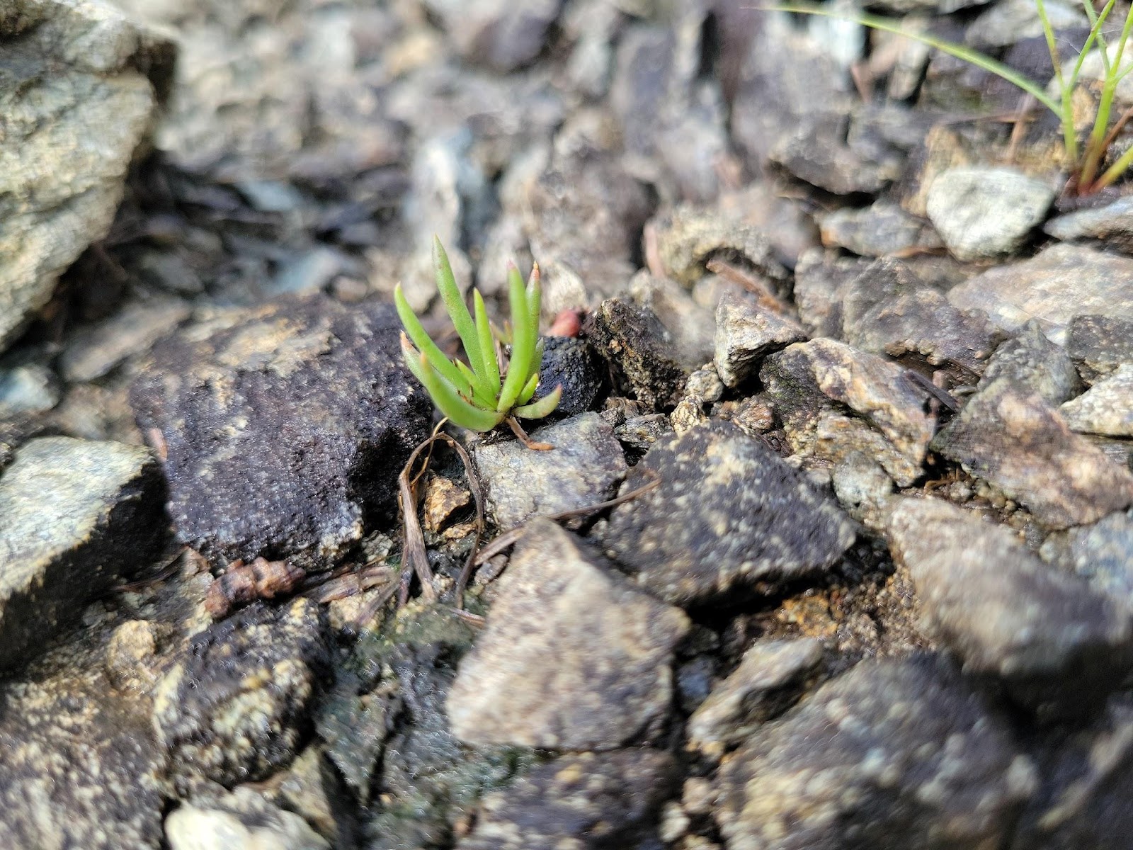 When we followed the trail out of the woods, we found exposed rock and gravel rather than dirt beneath our boots; there was very little soil, although just enough to make the gravel trail muddy after recent rains. To adapt to the nutrient-poor environment, plants in the serpentine gravel tend to have reduced, hairy, or succulent leaves. Among them is the round-leaved fameflower (Phemeranthus teretifolius), which has fleshy leaves and tiny pink flowers, which were not quite open on our morning visit. Other gravel forbs include serpentine aster (Symphyotrichum depauperatum) and lyre-leaved rockcress (Arabis lyrata).
