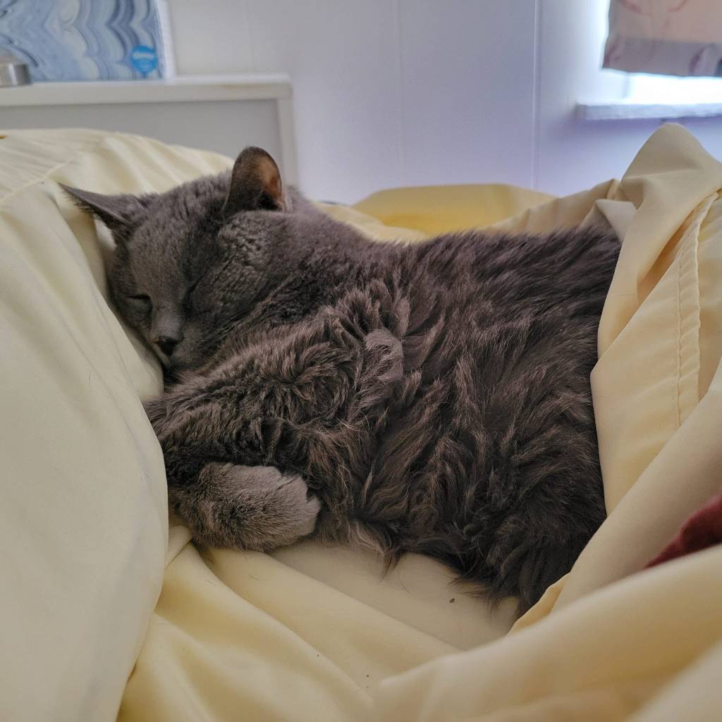 So it’s more plausible that I first saw her as a soft gray blur from a carrier to a large chest of drawers in my studio apartment. She stayed under there for several days, while her more outgoing sister came and went. They moved into my shoebox of a studio apartment in a temporary-turned-permanent arrangement when their previous carer moved away.