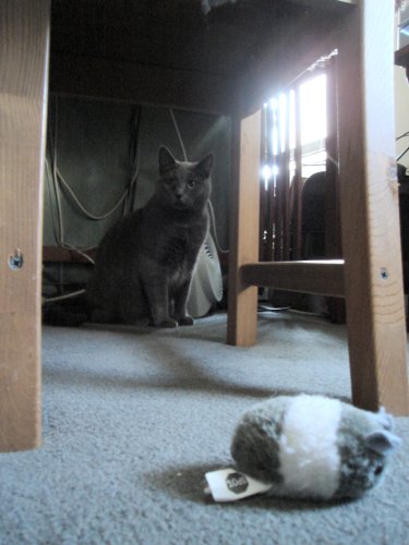 She loved toys. Almost all of my early memories of Ascher involve her bringing me something to play with. Fuzzy toy mice and shiny toy fish. A marvelous bouncing ball called a Zany that would careen in unpredictable directions if I threw it on uncarpeted floor. A motorized toy mouse that she washed in her water dish and dropped, sopping wet, by my office chair. Random things that she found around the house: twists of paper, a memory stick. She was happy to chase laser pointers and toys on strings with her sister–although, if Ascher caught the quarry, it was game over. She played for keeps.